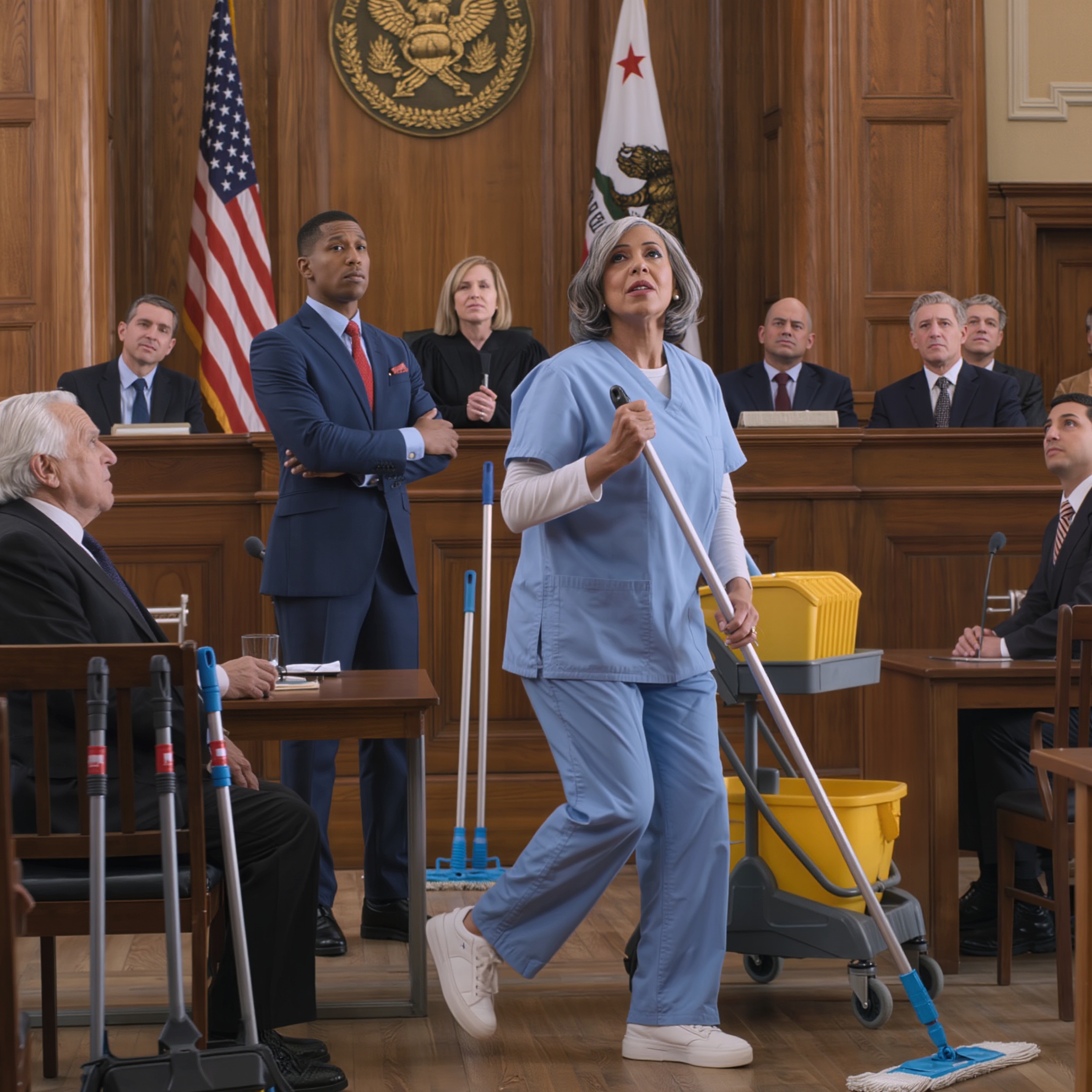Six months after fleeing my old life, I stood in the supply closet of the Riverside County Courthouse, staring at my reflection in a cracked mirror someone had taped to the inside of the door. The woman looking back at me was a stranger—graying hair pulled into a practical ponytail, hands roughened from industrial cleaning chemicals, wearing a faded blue uniform with “Alma” embroidered on the chest pocket.